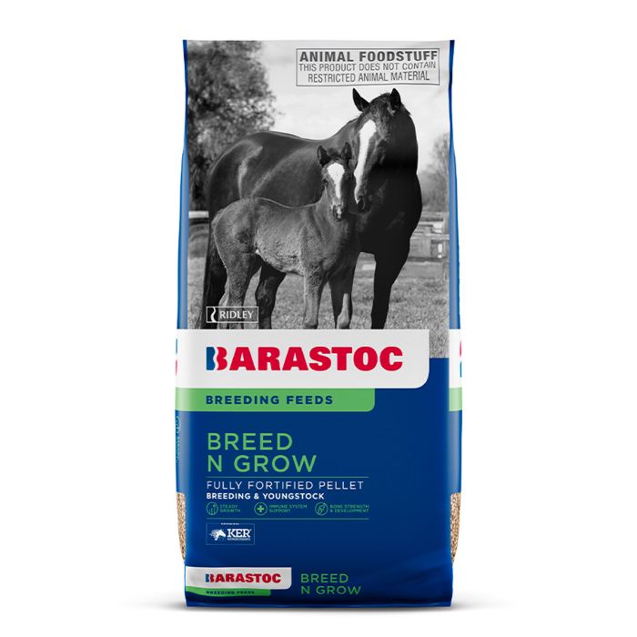 Breed N Grow - The Best Feed For Weanling Foals broodmares, breeding stallions, and yearlings Barastoc Breed N Grow is the ultimate full-feed pellet for broodmares, breeding stallions, weanling foals and yearlings that require a supplement to help gain weight. #1 Feed for Weanling Foals Barastoc Breed N Grow is the best horse feed to support healthy weanling foals. From conception through to gestation and into the first few years of growth, this fully fortified feed supports the complete nutrient requirements for horses, breeding horses and youngstock. With each pellet loaded with the ideal combination of vitamins and minerals, rapidly developing horses have the best chance of reaching peak physical conditioning with Barastoc Breed N Grow. What will Barastoc Breed N Grow do for my horse? A low starch formula to support the steady growth of youngstock and help minimise growth and developmental disorders. Fully fortified with vitamins, minerals and bio-available silicon to promote bone development and density, plus maintain skeletal integrity. Pelleted for nutritional consistency to ensure your horse receives the right balance of nutrients in every mouthful. Specially formulated to provide the nutrients required to maximize fertility and conception in breeding stock. Ideal for pregnant and lactating mares, weanlings, yearlings while as a conditioning feed for stallions prior to and during breeding season.