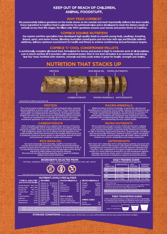Low in starch and low GI it provides calm sustained power. Rich in rice bran oil makes it an extremely cool energy ‘low fizz’ feed. Fortified with vitamins, minerals and fatty acids makes it great for health, strength and vitality.