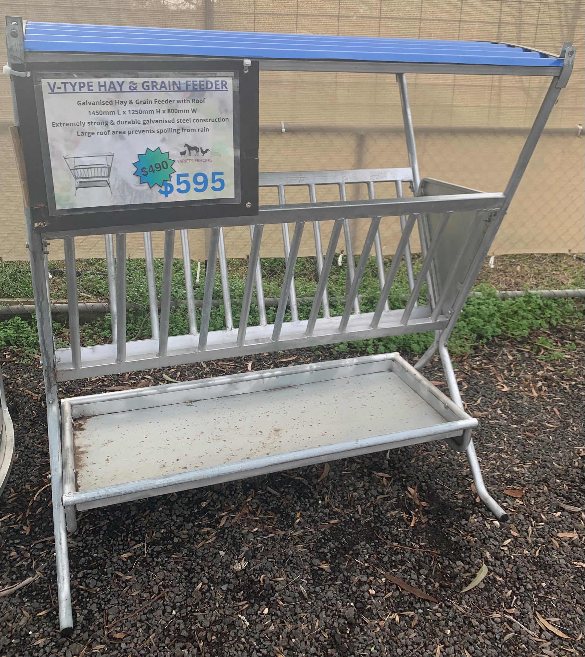 This hay feeder is great for sheep, goats and other smaller farm animals. It has a roof that fully covers the top, keeping hay dry and tray in the bottom to hold grains and other supplementary feeds.
